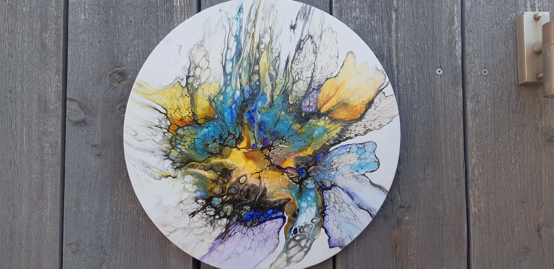Prachtig fluid art schilderij op een rond canvas van 40 cm doorsnede, waarin een gedeconstrueerde bloem tot leven komt.